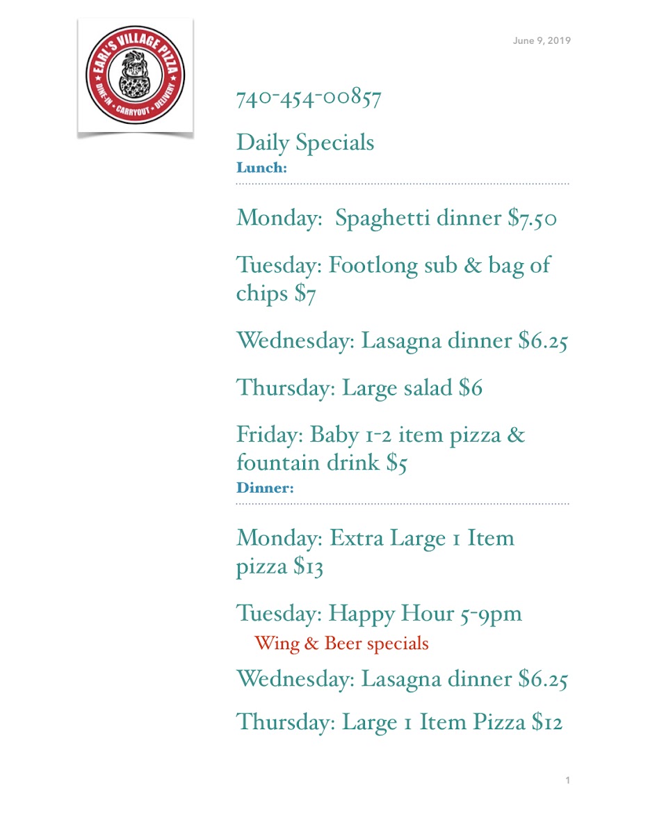 The menu at Earl's Pizza of Zanesville offers a straightforward, casual selection that suits a relaxed meal any day of the week. It's a comfortable mix of classic pizzas and familiar favorites that pair well with easygoing gatherings or a quiet night in.